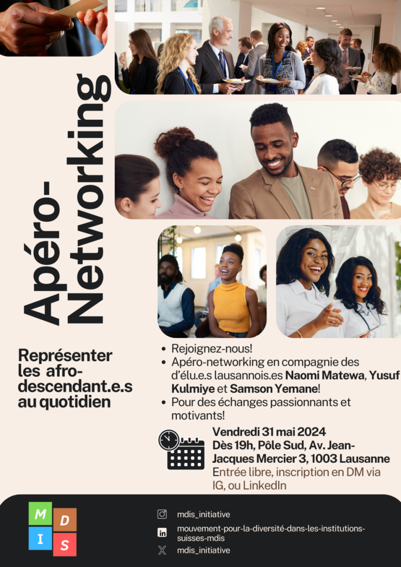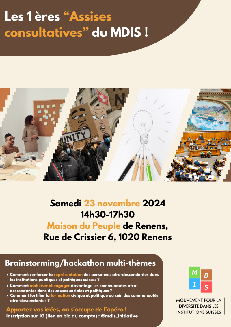Le Mouvement pour la Diversité dans les Institutions Suisses (MDIS) vous invite à la table ronde Repenser l’intégration professionnelle des Afro-descendant·e·s, un moment de réflexion et d’échange essentiel.